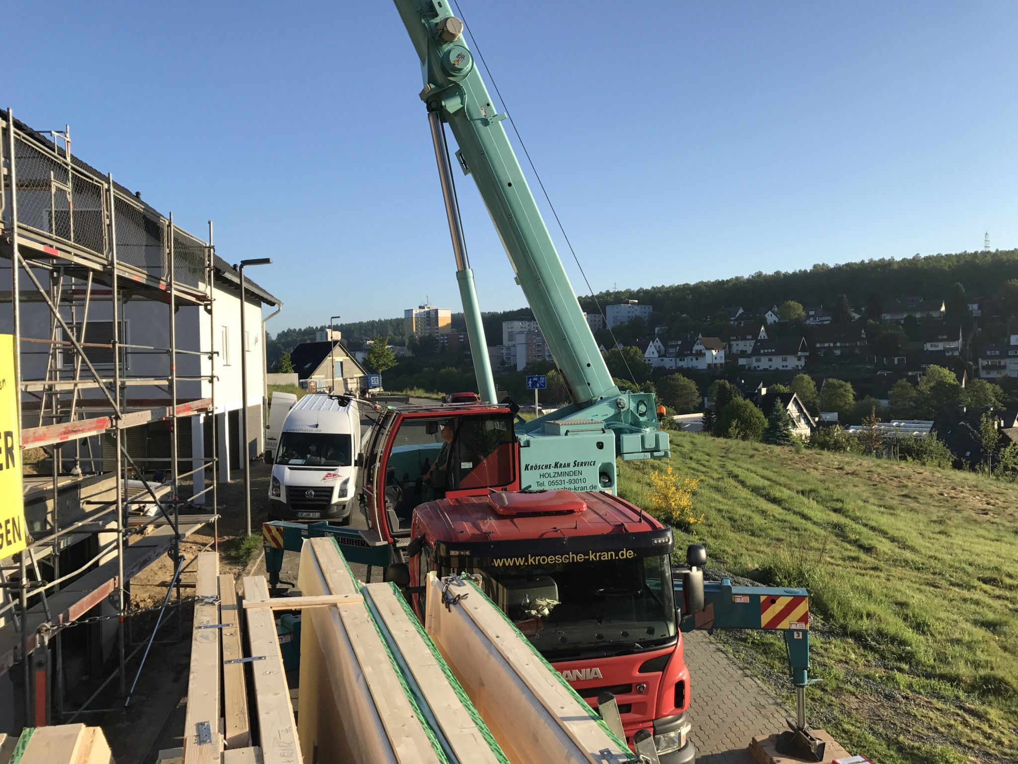 Klaus, unser heutige Kranfahrer von Krösche Kran Service, ist ein alter Bekannter und hat schon einige Häuser mit uns aufgestellt.