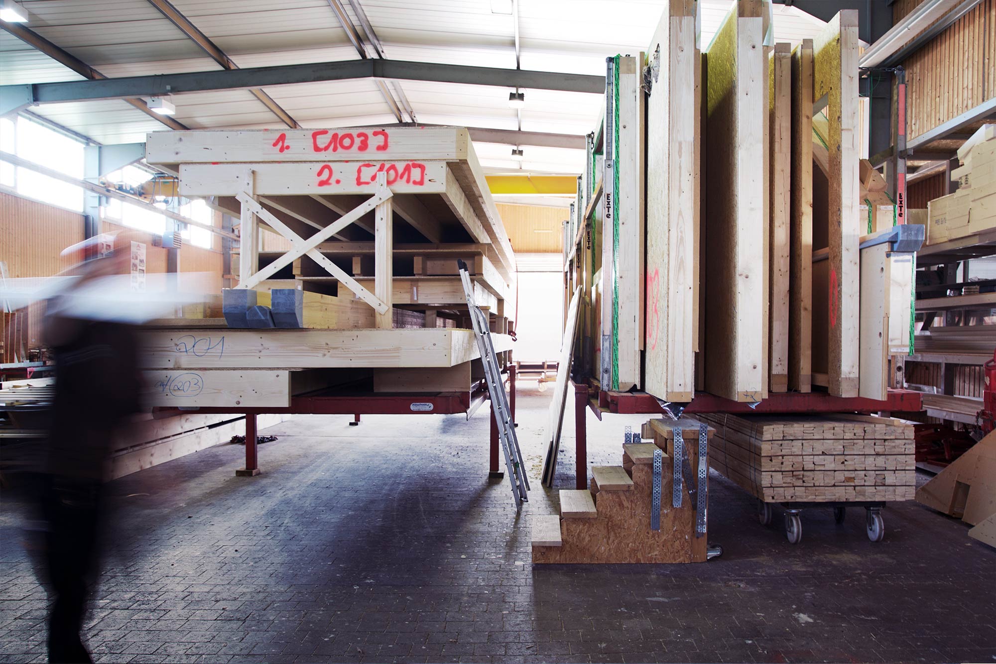 In unserer hauseigenen Produktionshalle fertigt unser kompetentes und eingespieltes Team Ihr Haus.