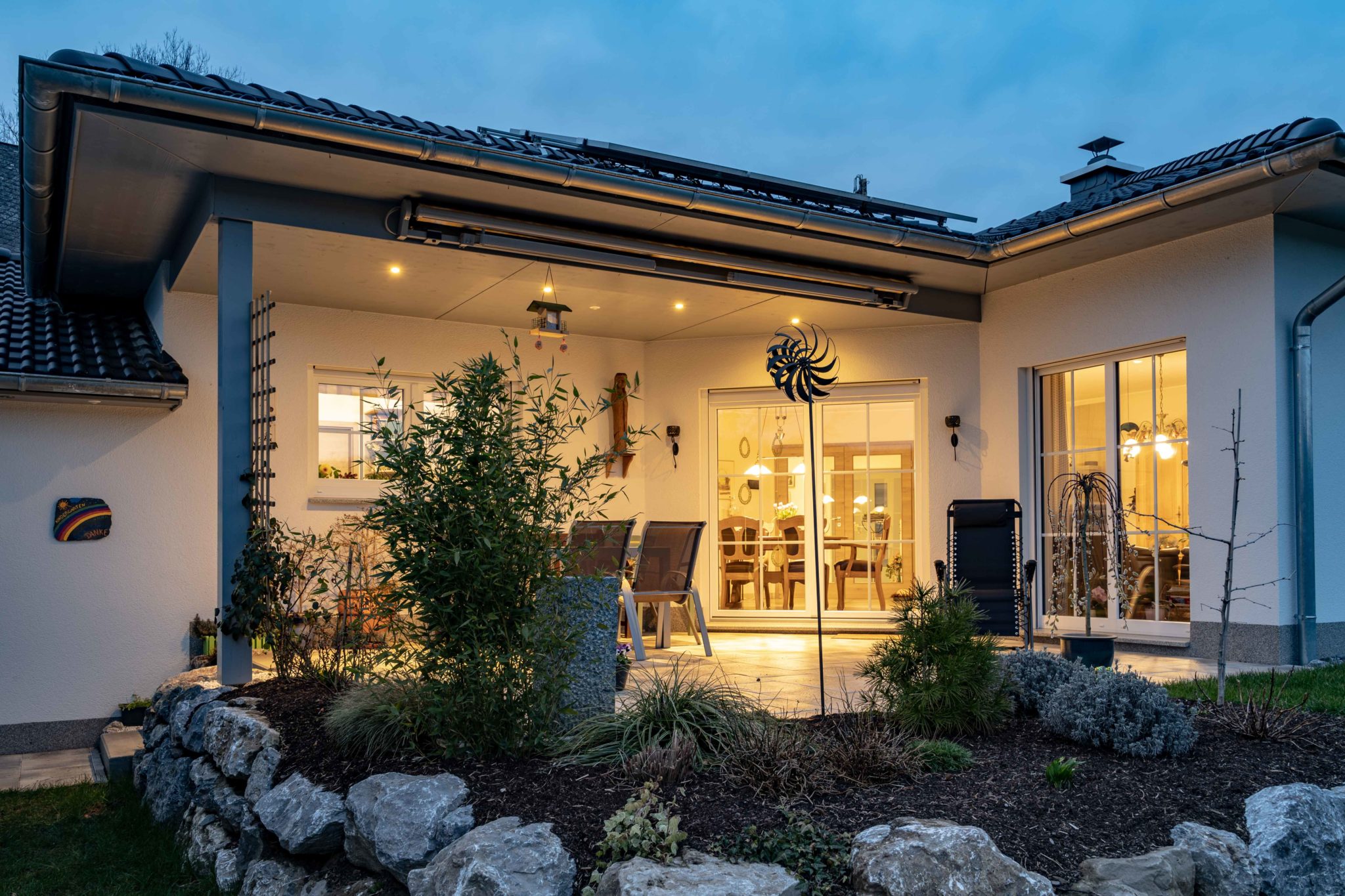 Durch die KFW 40 plus Umsetzung des Wohnhauses und die große Fläche der Photovoltaik-Anlage, kann mehr Strom in das öffentliche Netz oder die Hauseigene Batterie eingespeist werden, als verbraucht wird. Und das, obwohl in diesem Bungalow das Warmwasser durch einen Durchlauferhitzer geschaffen wird. Hier ist Energieeffizienz der modernsten Klasse geboten.
