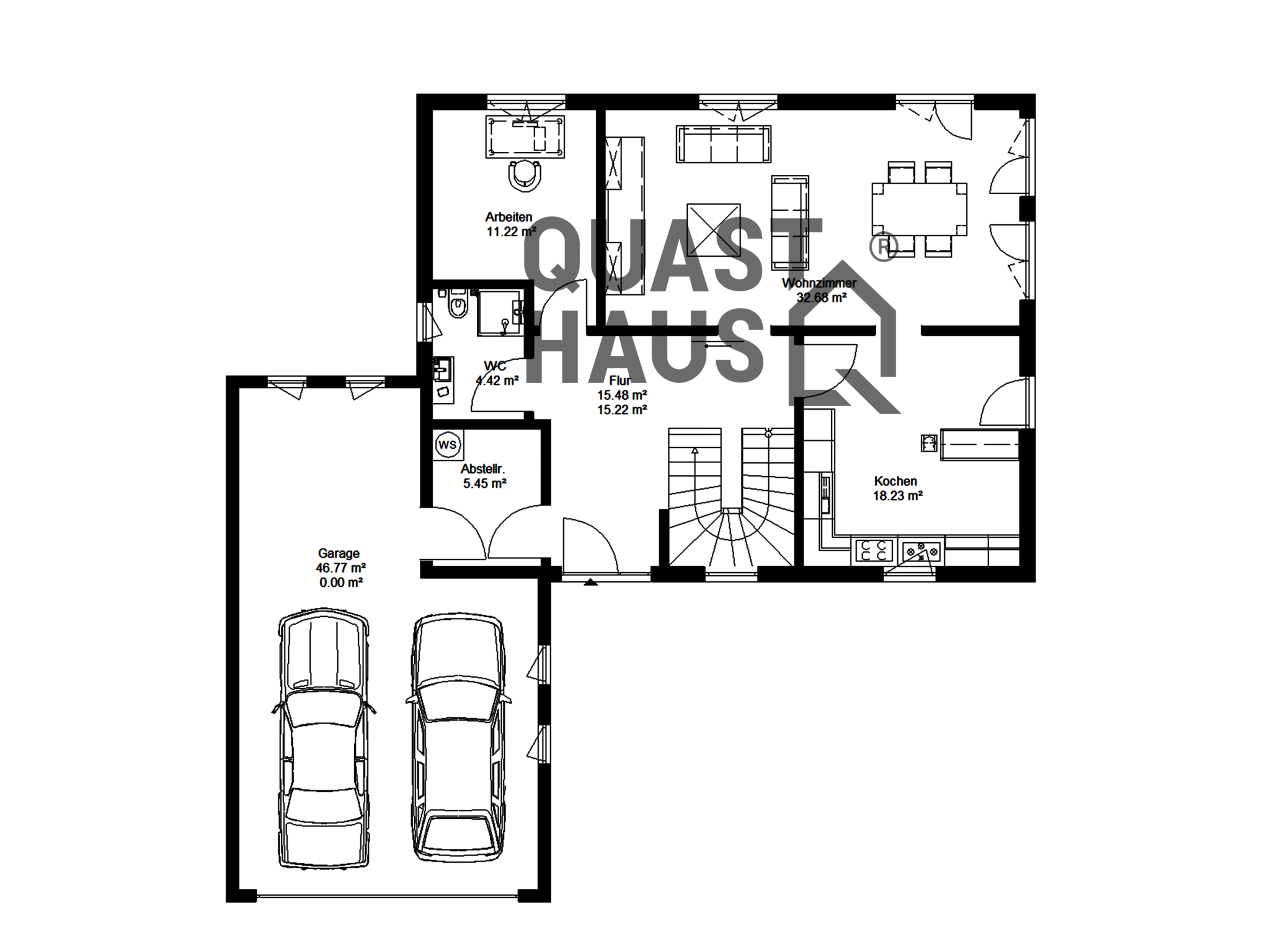 Die Garage ist bei diesem Quasthaus direkt in die Architektur des Hauses eingebunden und somit auch direkt begehbar. Durch die Teil-Unterkellerung der Garage konnte auch zusätzlicher Platz im Keller gewonnen werden.